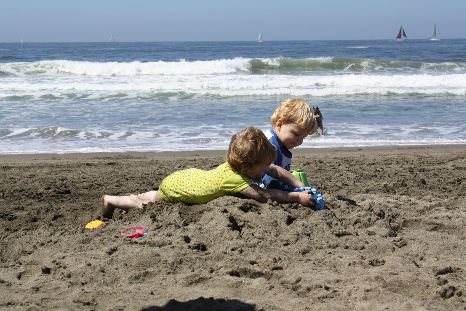 West's dearest, bestest friend Robert lives out near Ocean Beach and was kind enough to host us today for a play date. The kids had a blast together, running and digging and splashing and laughing and drinking up the beautiful weather. Oh, and getting absolutely covered in sand!